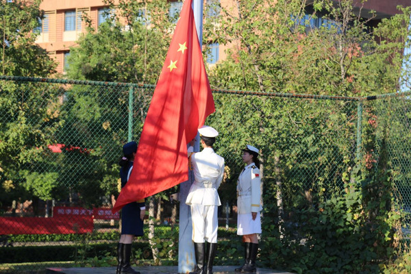 早上6时45分,升旗仪式开始。国旗护卫队步履铿锵,护送国旗到升旗台