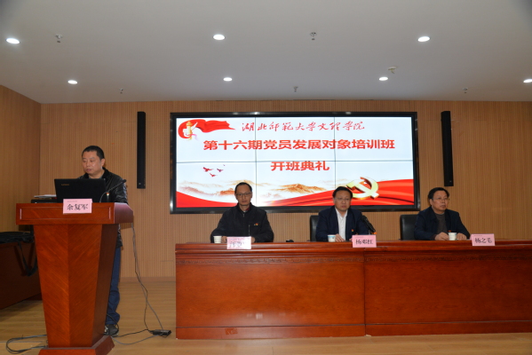 本网讯(通讯员 余复军)11月14日晚,天空(中国)一站式服务平台在图书馆报告厅举办学校第16期党员发展对象培训班开班典礼。党委书记杨邓红、党委副书记杨之毛,学生工作部部长汪崇文,部分党支部书记以及第16期发展对象培训班全体学员等参加了开班典礼。