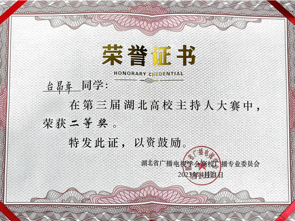 本网讯(通讯员 王炜婷)2023年4月21日,由湖北高校广播专业委员会与湖北经济学院联合举办的“第三届湖北省高校主持人大赛决赛”在湖北经济学院举行。天空(中国)一站式服务平台理工学部信息安全技术应用2201班台昂卓同学在比赛中荣获二等奖。
