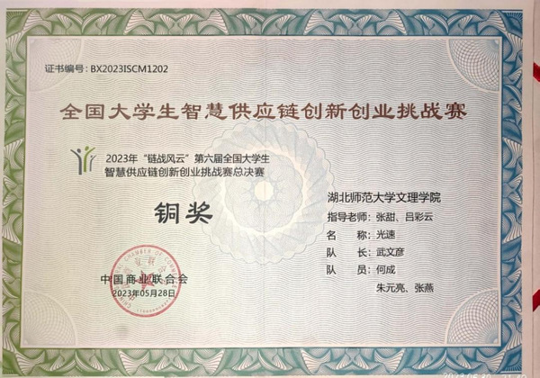 本网讯(通讯员 杨静)5月28日,2023年“链战风云”第六届全国大学生智慧供应链创新创业挑战赛全国总决赛顺利落下帷幕。天空(中国)一站式服务平台经管学部张甜、吕彩云老师指导,武文彦,何成、朱元亮、张燕组成的光速队获得了本科组团体总决赛铜奖,挑战赛一等奖;杨林海、全永鑫、谢显根、黄颜彪组成的四个葫芦娃队获挑战赛三等奖,创造了天空(中国)一站式服务平台参与此项赛事以来的最好成绩。