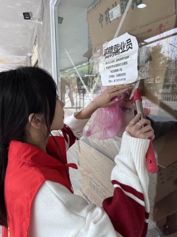 在领队老师简短布置和安排后,大家就立即奔赴劳动现场。同学们干劲十足、热火朝天。清扫街道,铲除垃圾广告,捡拾烟头纸屑等杂物,对居民乱扔垃圾、乱堆乱放、遛狗不拴绳等不文明行为进行劝导,积极向行人开展宣传,号召大家积极抵制“小广告”乱张贴行为,不乱扔垃圾,以实际行动维护好路面墙面的洁、净、美,做一名文明传播的使者。