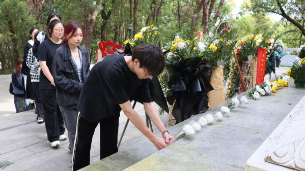 在烈士纪念碑前,学子们庄严肃立,默哀并鞠躬致敬,瞻仰革命先烈的英雄事迹,重温红色革命精神。