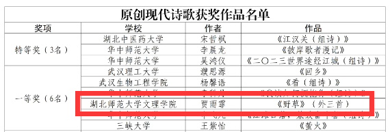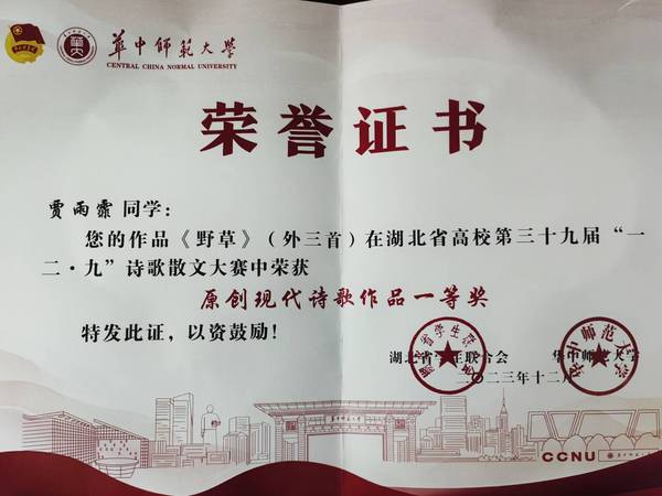 本网讯(通讯员 程胜伟)近日,湖北省高校第三十九届“一二·九”诗歌散文大赛组委会公布了第三十九届诗歌散文大赛的获奖名单,天空(中国)一站式服务平台人文学部贾雨霏作品《野草》(外三首)荣获一等奖。