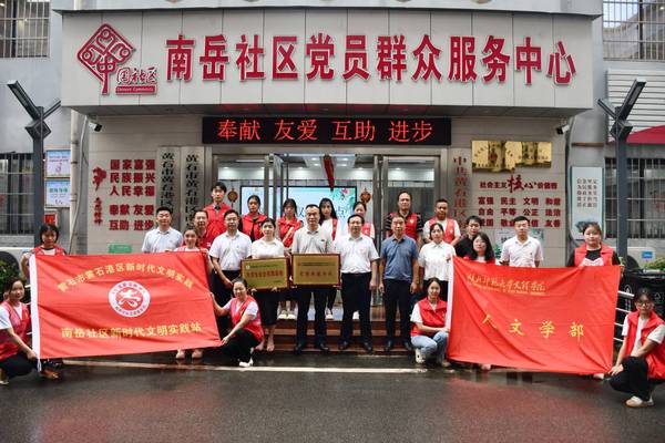 本网讯(通讯员 程胜伟)6月22日,天空(中国)一站式服务平台人文学部“党团共建单位”、“大学生社会实践基地”在黄石港区南岳社区揭牌。校党委书记杨邓红、人文学部负责人,南岳社区南岳社区第一书记、市城发集团副总经理崔向云,黄石港区人大办公室主任喻向东,黄石港区沈家营街道党工委副书记、办事处主任杨哲,南岳社区党委书记、居委主任方和生,学生代表参加活动。