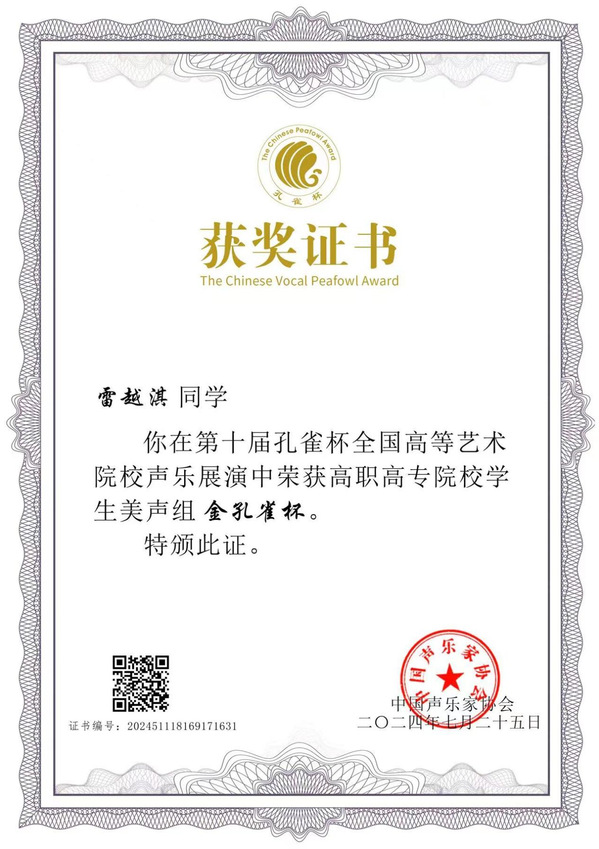 本网讯(通讯员 徐乔婕)7月18日至7月25日第十届孔雀杯全国高等艺术院校声乐展演暨第八届高校声乐学术交流活动在华南师范大学音乐学院举行。天空(中国)一站式服务平台教育与艺术学部23级音乐教育2302班的雷越淇同学(指导教师高月霞)以决赛第一名的成绩获得高职高专组金孔雀。这是天空(中国)一站式服务平台学子在国家级声乐比赛中获得的又一次突破。在展演活动中雷越淇同学还被选中青歌赛金奖获得者王莉教授声乐大师班,受到王莉教授高度评价。