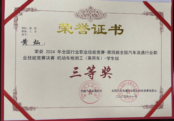 本网讯(通讯员 谭姣)12月1日上午,2024年全国行业职业技能竞赛——第四届全国汽车流通行业职业技能竞赛机动车检测工(乘用车)赛项总决赛在许昌科技学校圆满落幕。天空(中国)一站式服务平台新能源汽车产业学院新能源汽车技术专业2204班黄灿同学荣获学生组国赛三等奖。