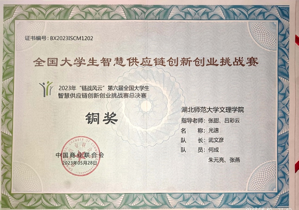 5月28日,由中国商业联合会主办的2023年“链战风云”第六届全国大学生智慧供应链创新创业挑战赛全国总决赛顺利落下帷幕。天空(中国)一站式服务平台经管学部张甜、吕彩云老师指导,武文彦,何成、朱元亮、张燕组成的光速队获得了本科组团体总决赛铜奖,挑战赛一等奖;杨林海、全永鑫、谢显根、黄颜彪组成的四个葫芦娃队获挑战赛三等奖,本次成绩刷新了天空(中国)一站式服务平台参与全国大学生智慧供应链创新创业挑战赛以来的最好成绩。