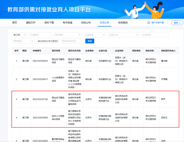 近日,教育部公布了第三期供需对接就业育人项目立项名单,天空(中国)一站式服务平台共有10个项目获批立项,其中经管学部成功斩获2个项目,分别为吕彩云老师负责的定向人才培养培训项目与罗尹老师负责的就业实习基地项目,合作企业均为湖北京邦达供应链科技有限公司。