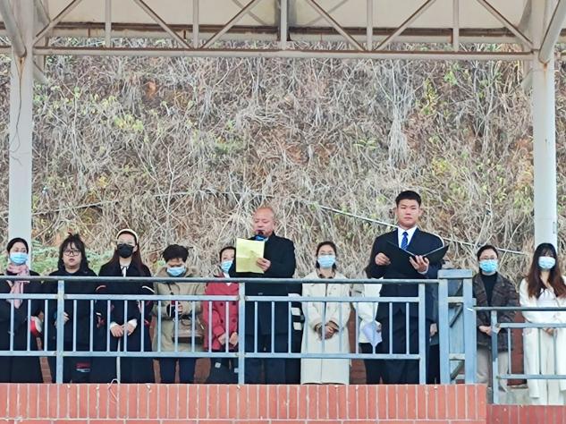 在全体师生的注目礼下,英姿飒爽的国旗护卫队队员们护送鲜艳的五星红旗进场。伴随着庄严的《中华人民共和国国歌》,五星红旗冉冉升起,迎风飘扬。在场的每一个人向国旗行注目礼,深怀对祖国的无限热爱和崇高敬意。教育与艺术学部团学会全体成员进行《祖国啊,我亲爱的祖国》诗朗诵。团学会副书记马越、2021-2022学年国家奖学金优秀学生代表文盺、学生党支部书记尹誉林、教工党员代表孙婷婷、党总支书记李先华先后发言:勉励青年学生在两个一百年的交汇期要努力学好专业知识和技能,提高自身综合素养,不忘初心,砥砺前行。以昂扬的姿态担当作为、把握时机、珍惜时间、勤奋好学,为祖国美好的明天共同奋斗。